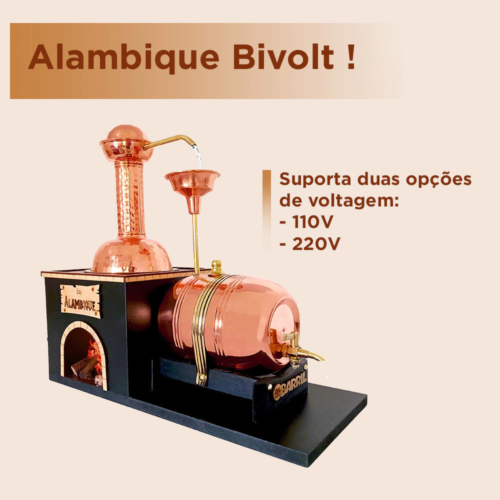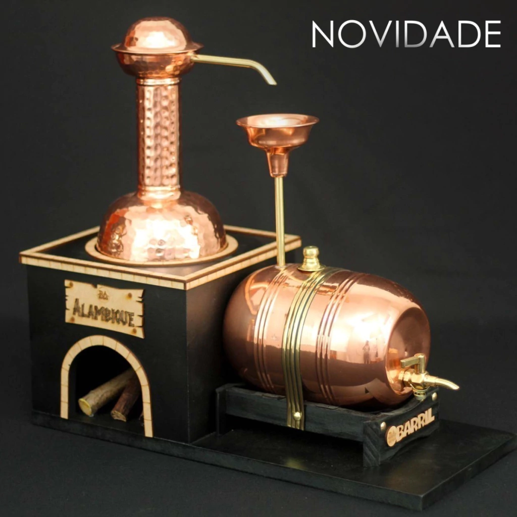 Com uma fonte giratória de cachaça e uma lâmpada que reproduz o fogo na fornalha, este alambique cria um espetáculo visual que encanta e surpreende. Além disso, serve como um barril funcional, com capacidade para 2 litros, perfeito para armazenar sua cachaça com estilo.