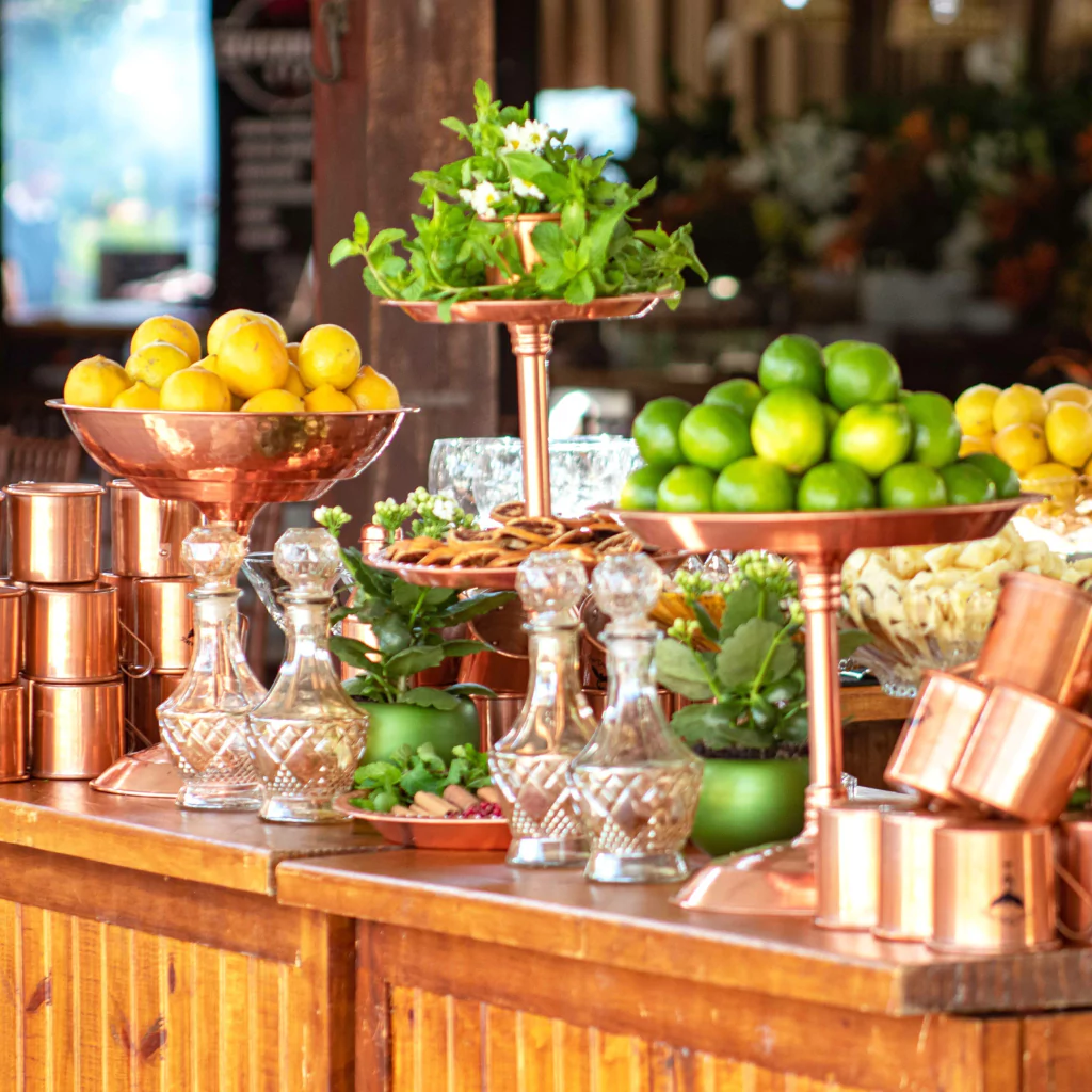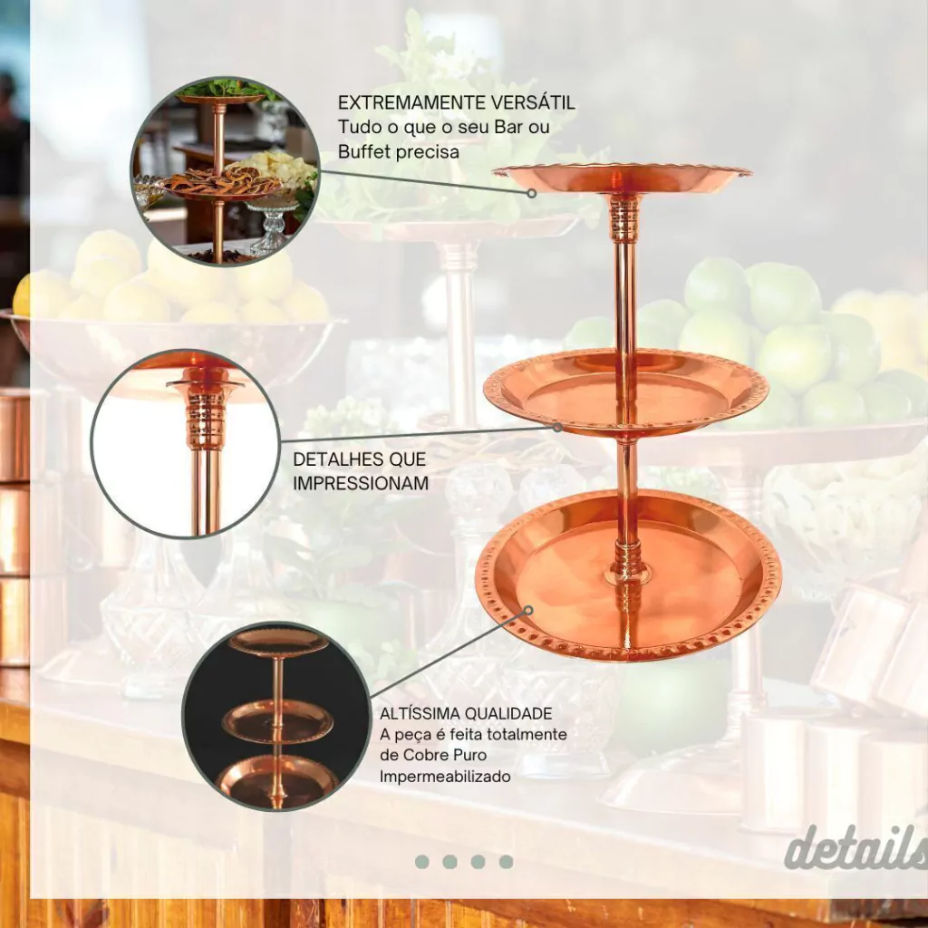 Feita artesanalmente com cobre de alta qualidade, cada detalhe desta bandeja revela um acabamento impecável, com um brilho radiante que encanta qualquer ambiente. Os três andares oferecem espaço generoso, permitindo distribuir petiscos, bebidas ou itens decorativos de forma elegante e organizada. Sua estrutura resistente e impermeabilizada garante que o brilho do cobre seja preservado por anos, resistindo às rotinas do uso diário.