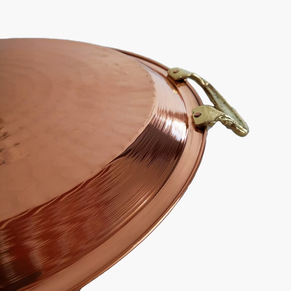 Material: Cobre Puro Alças: Liga de Bronze Diâmetro: 34 cm Altura da borda: 2 cm Peso: 0,790 Kg Espessura: 0,74 mm