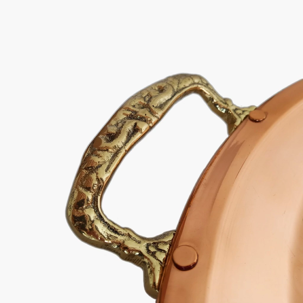 O acabamento martelado em brilho confere um charme único e um toque rústico que encanta, enquanto as alças em liga de bronze garantem robustez e praticidade no manuseio. Além disso, a impermeabilização especial protege o cobre da oxidação, permitindo que você lave a bandeja diariamente na máquina de lavar louças sem se preocupar com manchas ou desgaste.