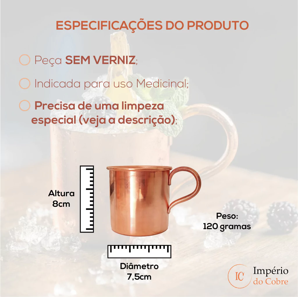 Feita artesanalmente com cobre puro, nossa caneca apresenta bordas arredondadas que garantem conforto e segurança ao beber. Com capacidade de 350 ml, é o tamanho ideal para suas bebidas favoritas, seja um refrescante Moscow Mule ou um elixir saudável.