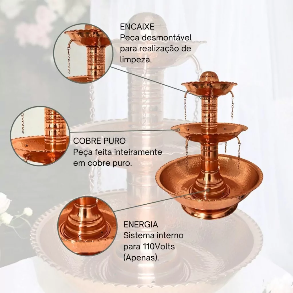 Feita artesanalmente em cobre puro, a cascata não é apenas um objeto decorativo, mas um convite para brindar à vida com requinte. O cobre, conhecido por sua durabilidade e beleza singular, mantém a temperatura ideal da bebida, realçando a nobreza do vinho servido.