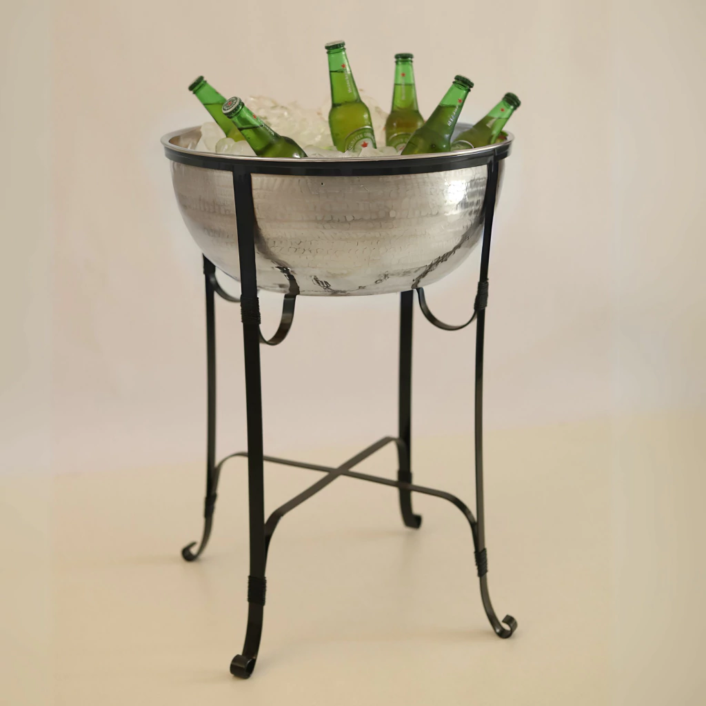 Seu acabamento prata brilhante confere um toque de glamour, enquanto o suporte de ferro garante estabilidade e durabilidade excepcionais. Medindo 70 cm de altura e com uma bacia ampla de 50 cm de diâmetro, acomoda várias garrafas com praticidade.