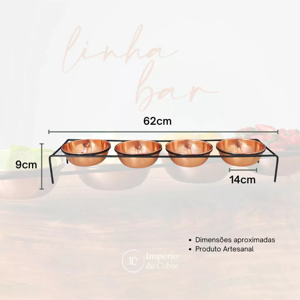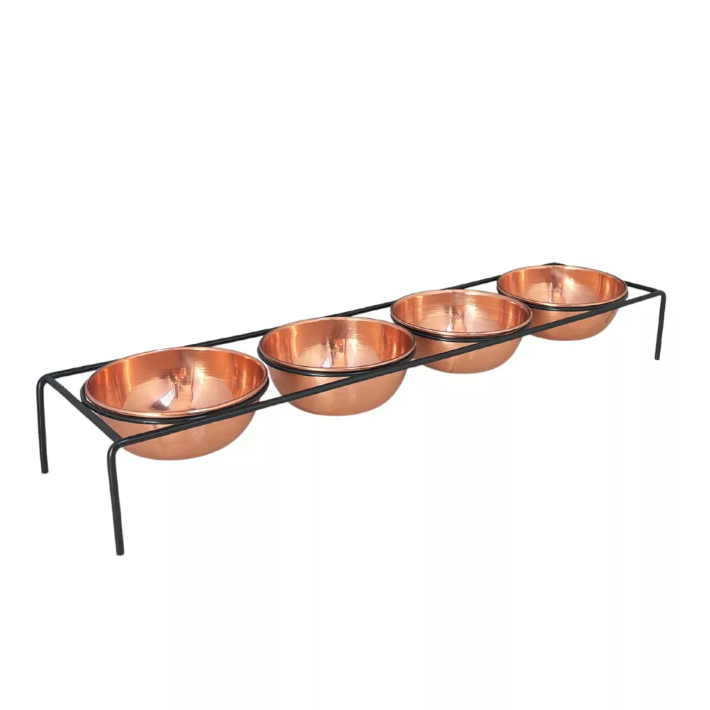 Com quatro bowls de cobre dispostos em uma estrutura de metal, ele proporciona uma apresentação sofisticada que impressiona qualquer convidado. O brilho do cobre contrasta belamente com a base escura, adicionando um toque moderno à sua mesa.