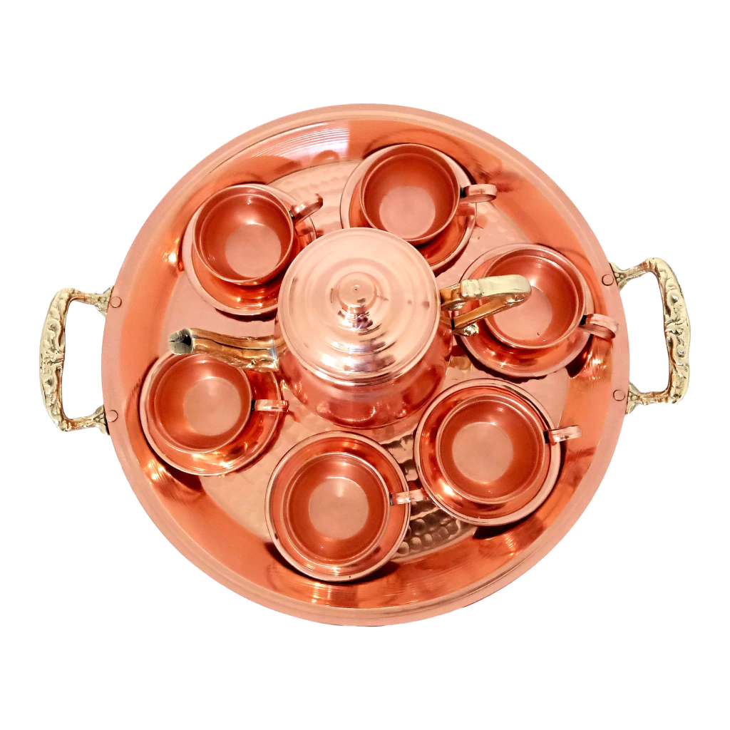 Descubra o charme e a sofisticação do Jogo de Xícaras em Cobre Puro, perfeito para transformar seus momentos de café ou chá em uma experiência única e elegante. Produzidas em cobre puro, essas xícaras de 80ml com seus pires acompanham um bule e uma bandeja que elevam a apresentação da sua bebida favorita, seja um café com leite, um expresso ou um capuccino.
