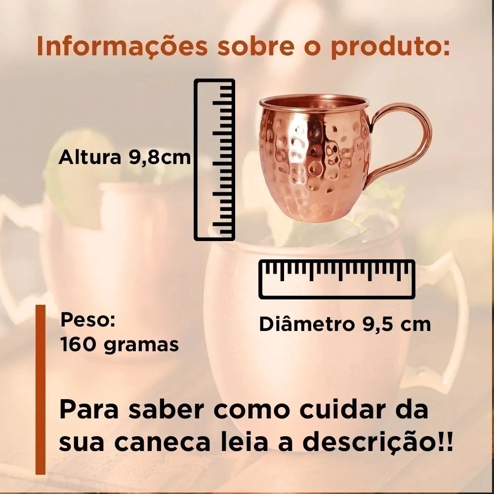 Transforme seus momentos de confraternização com o charme e a tradição das canecas de cobre puro. Um presente ideal para amantes de coquetelaria, que alia funcionalidade, design e durabilidade. Aproveite a elegância e o frescor do Moscow Mule servido da forma mais autêntica!