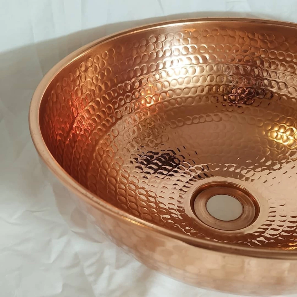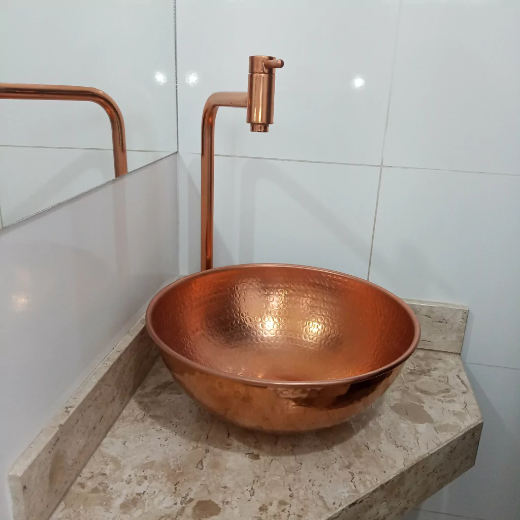 Kit Cuba de Apoio em Cobre Puro 8 Lts Sem Alças + Válvula: uma peça artesanal que une beleza e funcionalidade. Feita em cobre puro com impermeabilização epóxi, oferece resistência e brilho duradouro. Com 33 cm de diâmetro e 16 cm de altura, transforma cozinha, banheiro ou lavabo com elegância única. Produto artesanal, com pequenas variações naturais. Adquira já e encante-se!