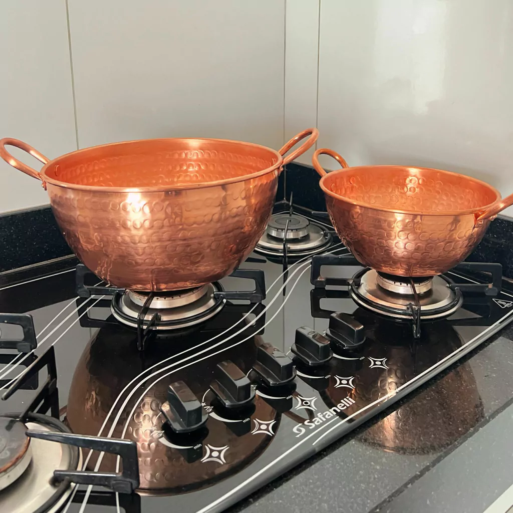 Feito à mão com cobre puro de alta resistência, cada tacho é cuidadosamente martelado para garantir um acabamento que une beleza e funcionalidade. Suas alças em cobre não apenas conferem um charme rústico, mas também proporcionam maior durabilidade.