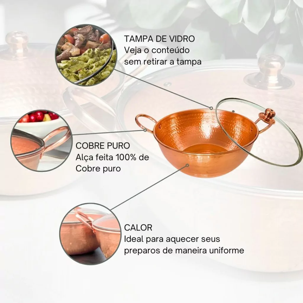 Produzido artesanalmente em cobre puro de alta resistência, este tacho não apenas garante a durabilidade, mas também realça os sabores dos alimentos, permitindo que suas receitas ganhem vida e autenticidade. O acabamento martelado traz um toque de elegância, enquanto as alças em cobre oferecem segurança e charme ao manuseio.
