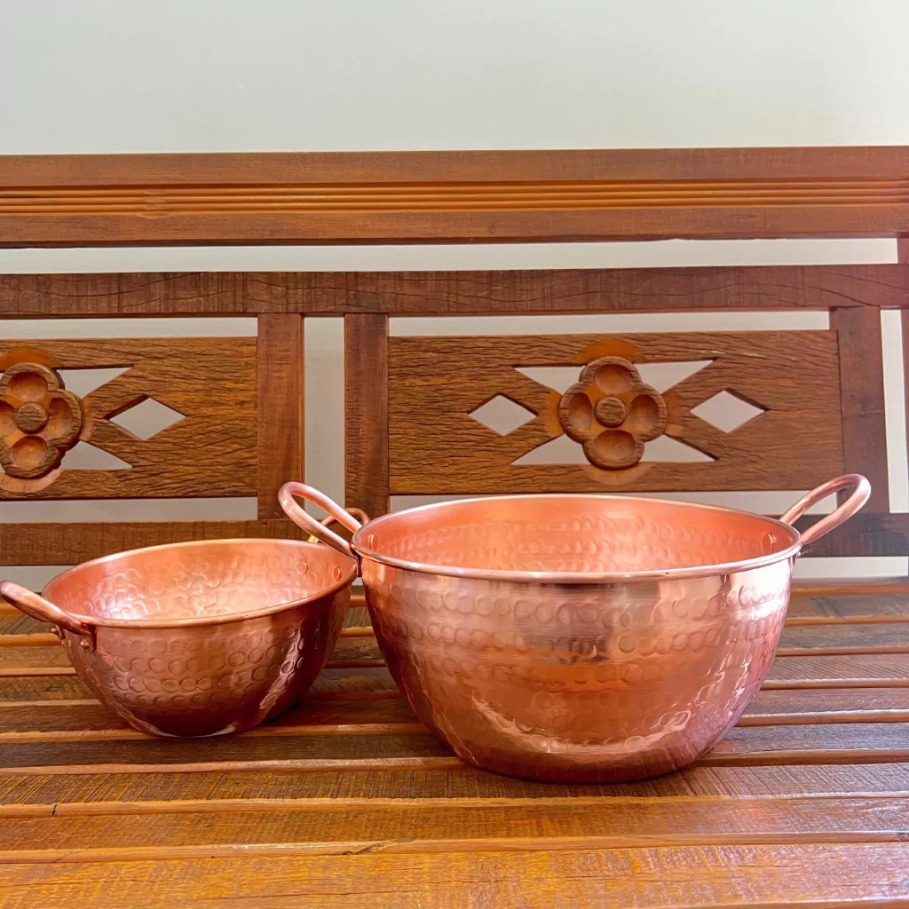 Cuidados e manutenção: A limpeza do seu tacho de cobre é simples e segura. Use limão com sal e uma esponja de aço suave para manter seu brilho natural. O cobre é um metal que não risca facilmente e oxida de forma natural, o que não compromete a qualidade do utensílio. Enxágue, seque imediatamente e deixe secar ao sol para preservar sua beleza por anos.