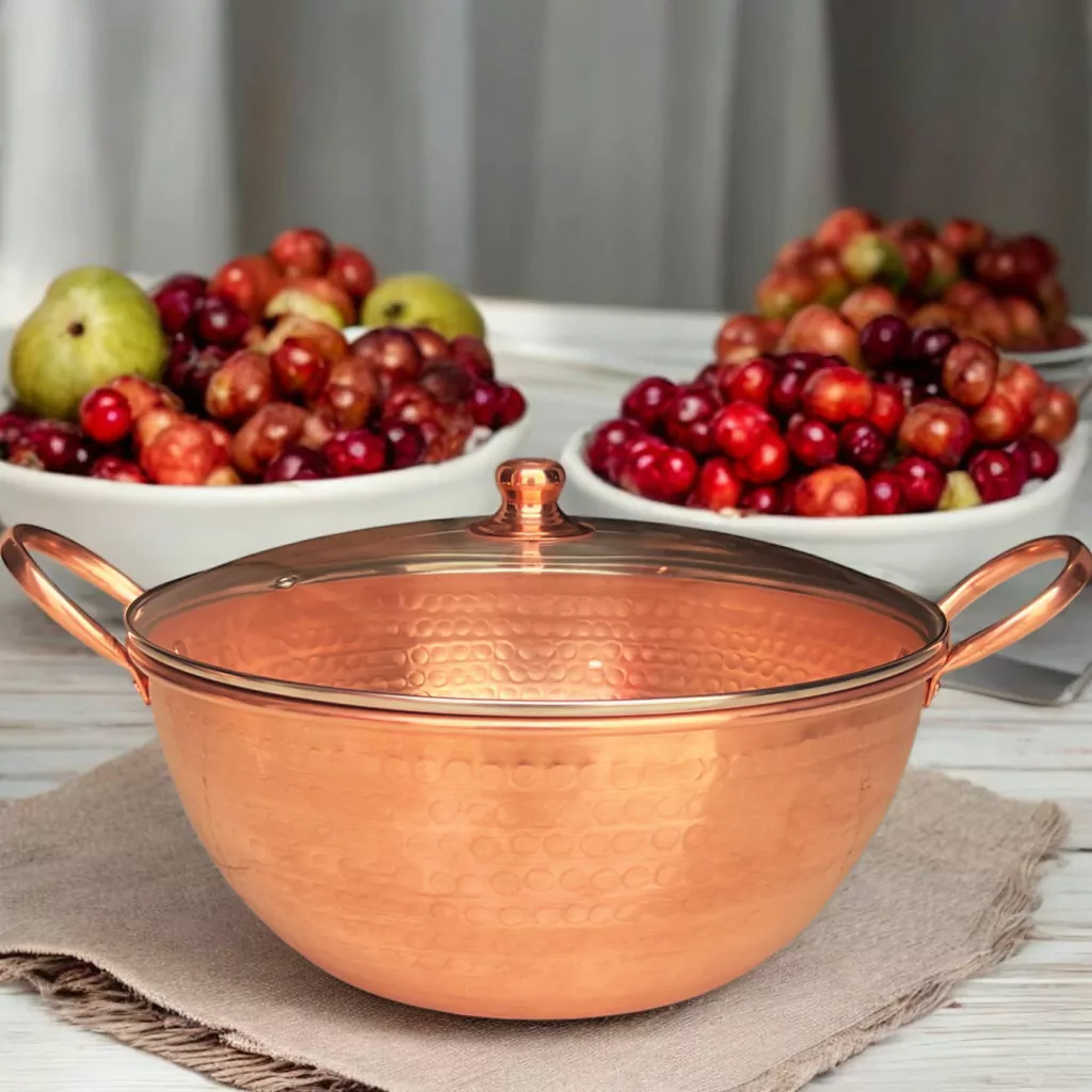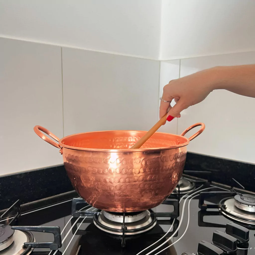 Feito artesanalmente com cobre puro, o tacho é projetado para garantir durabilidade e resistência excepcionais. Seu acabamento martelado não só confere um visual encantador, mas também maximiza a funcionalidade, tornando cada preparo uma experiência única. As alças em cobre proporcionam um toque de charme e praticidade, permitindo que você manuseie com facilidade.