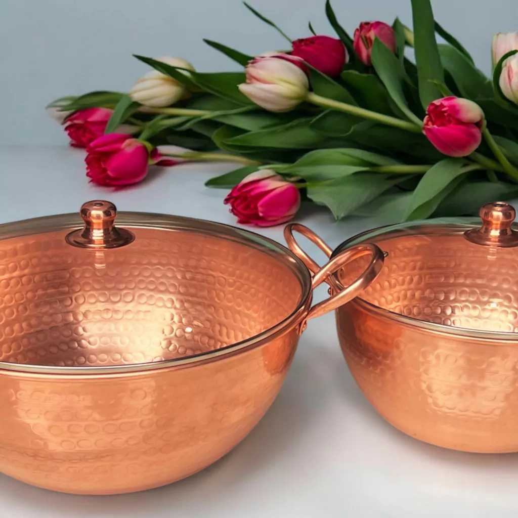 Tacho De Cobre Puro 8 Litros Com Tampa de Vidro e Alças de Cobre